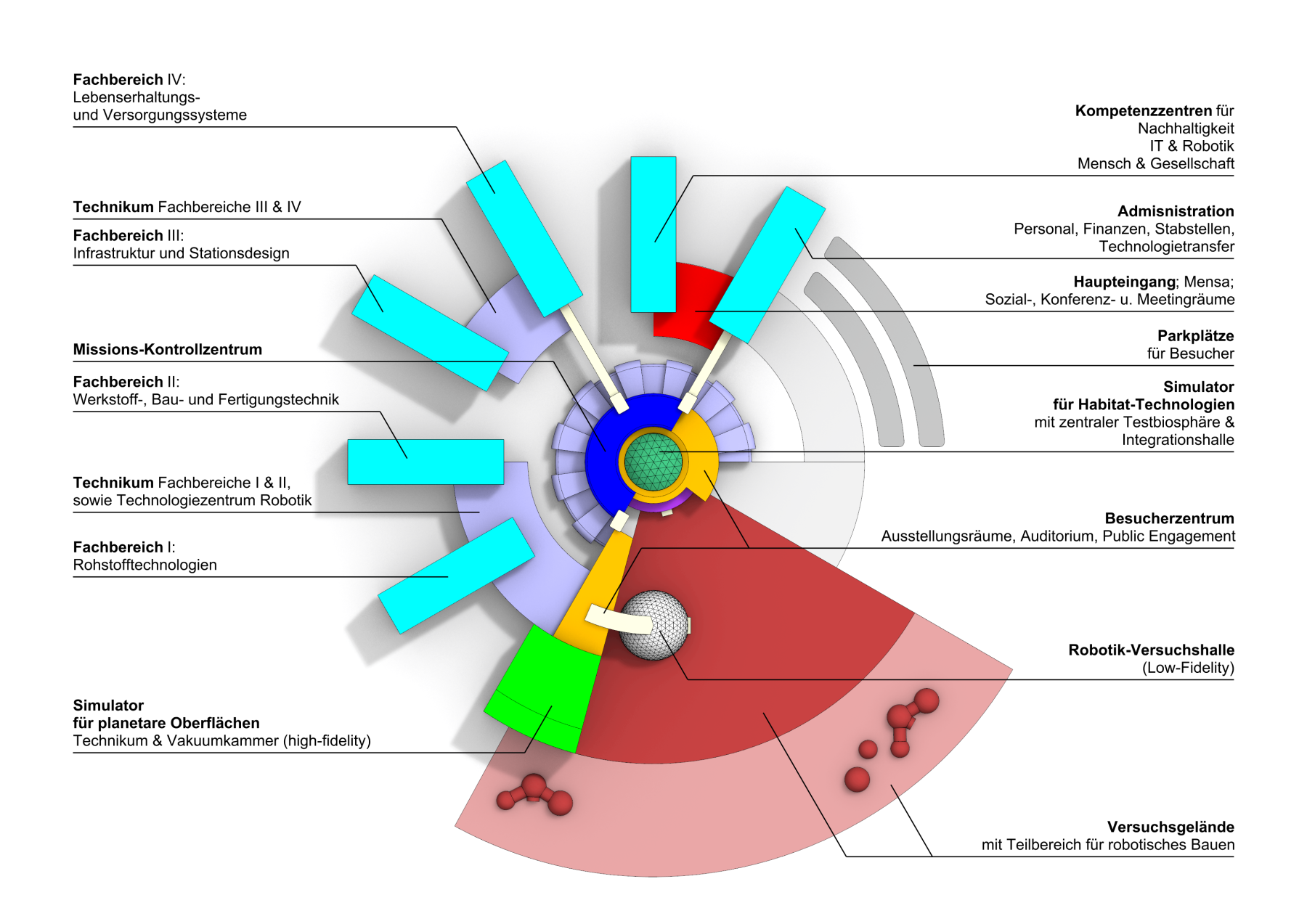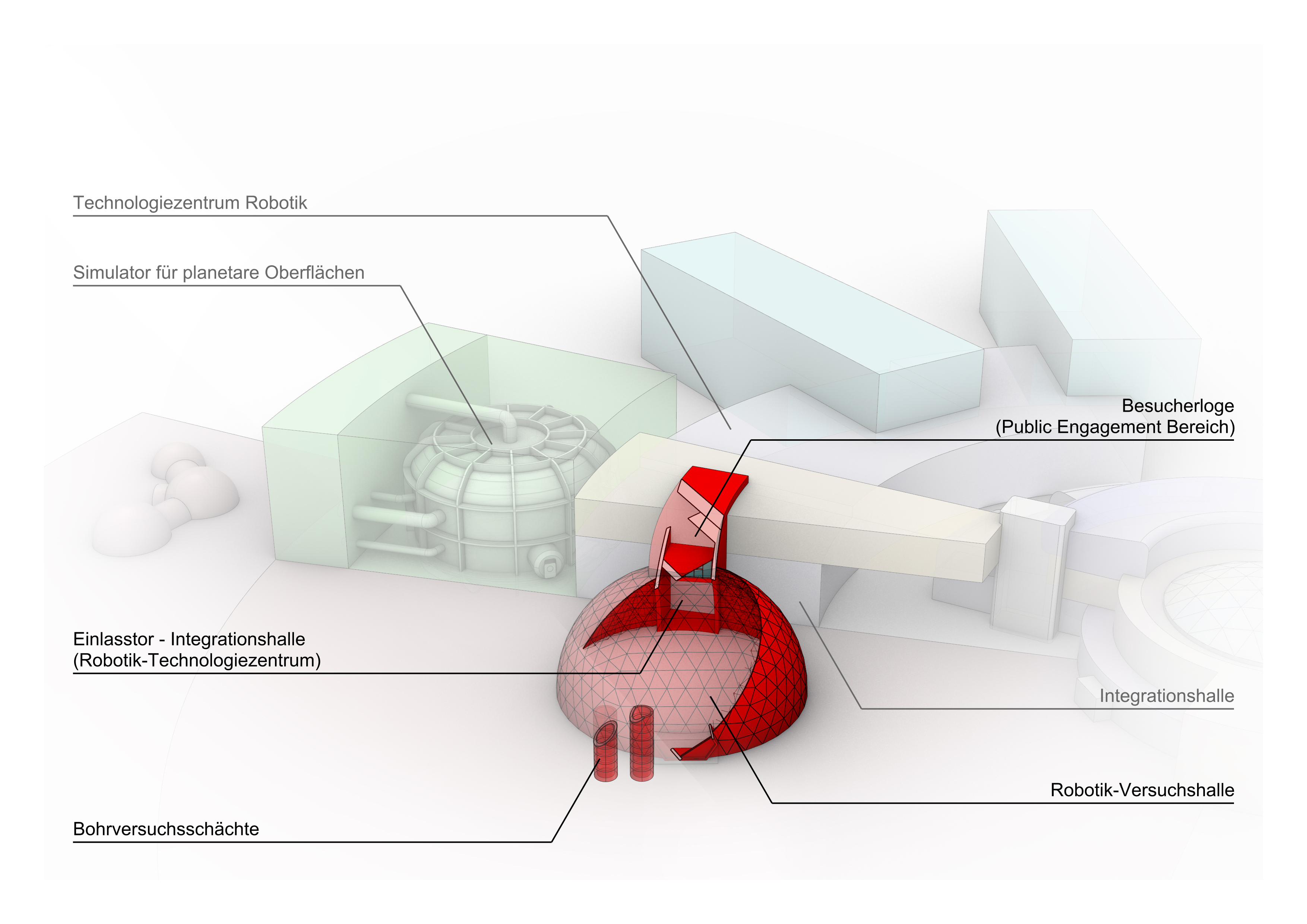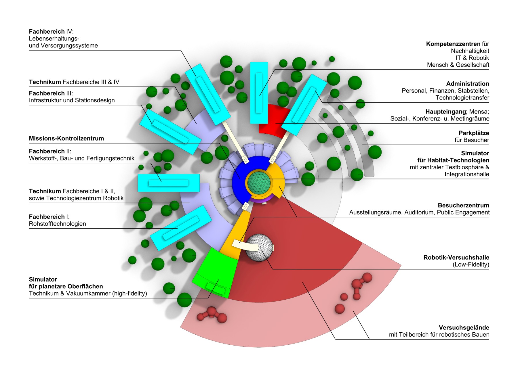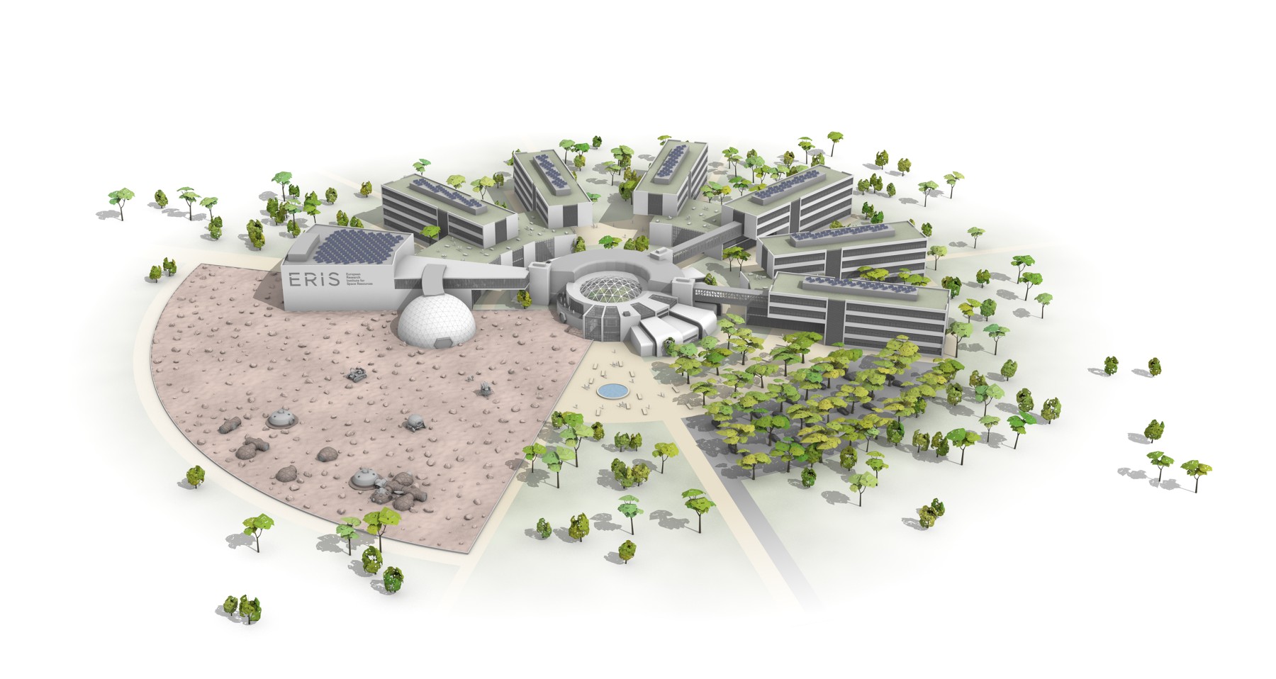 Im Zentrum des ERIS-Campus steht das Forschungsgebäude mit den zentralen Infrastruktureinrichtungen sowie Büro- und Laborgebäuden für ca. 1.000 Wissenschaftler. Die kompakte Bauweise sowie die bestehenden Verbindungen zwischen allen Gebäudeteilen fördern den wissenschaftlichen Austausch über Disziplinengrenzen hinweg. Ein zentrales Missions-Kontrollzentrum ermöglicht die Überwachung und Steuerung sowie Zusammenschaltung aller Versuchseinrichtungen, so dass komplexe Simulationsmissionen ermöglicht werden. Ein integriertes Besucherzentrum ermöglicht Einblicke in die zentralen Forschungsbereiche sowie eindrucksvolle Erlebnisse wir virtuelle Führungen in Mond- und Marsstationen, um das Bewusstsein für den Wert von Ressourcen und deren nachhaltige Nutzung zu vermitteln.
