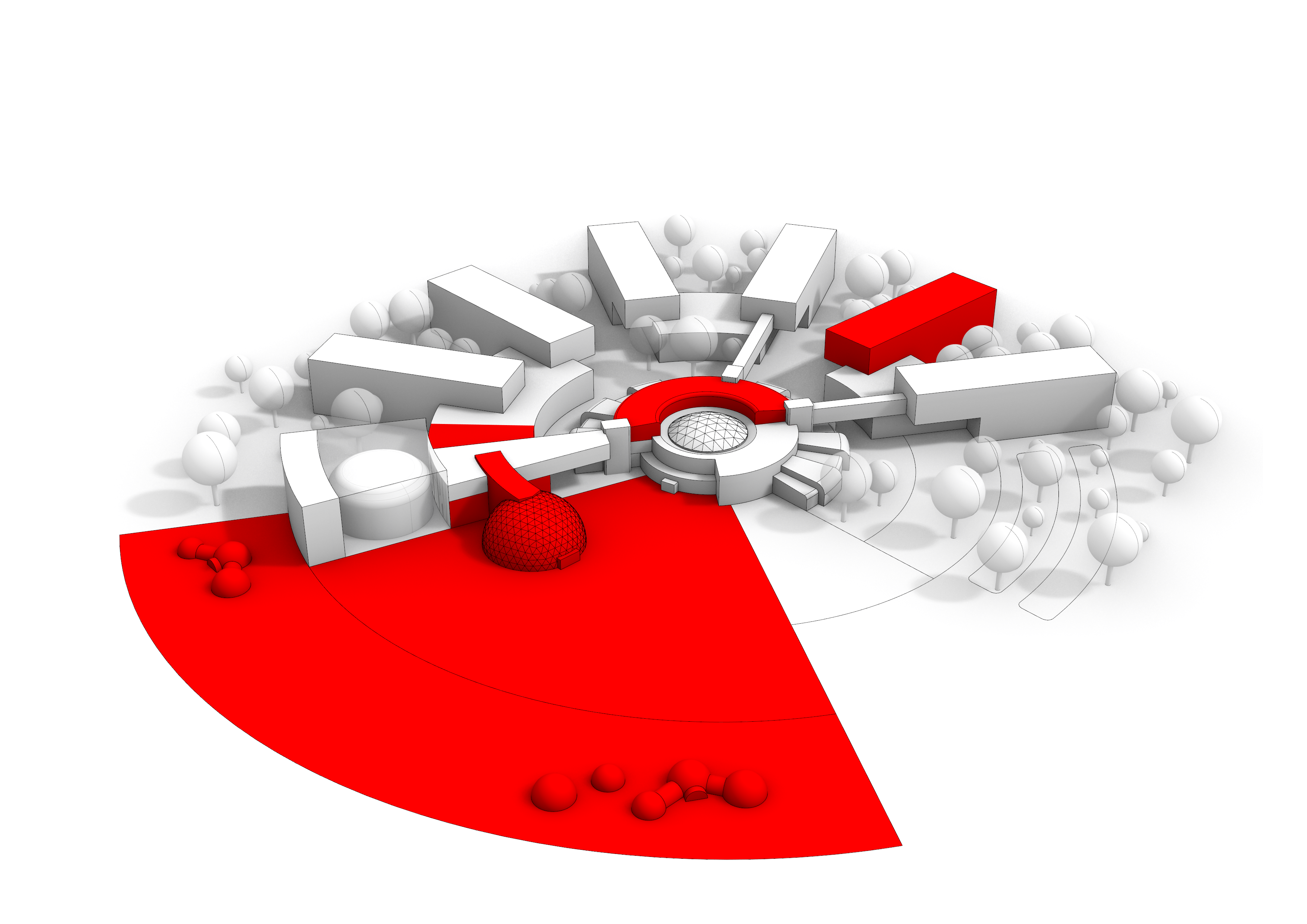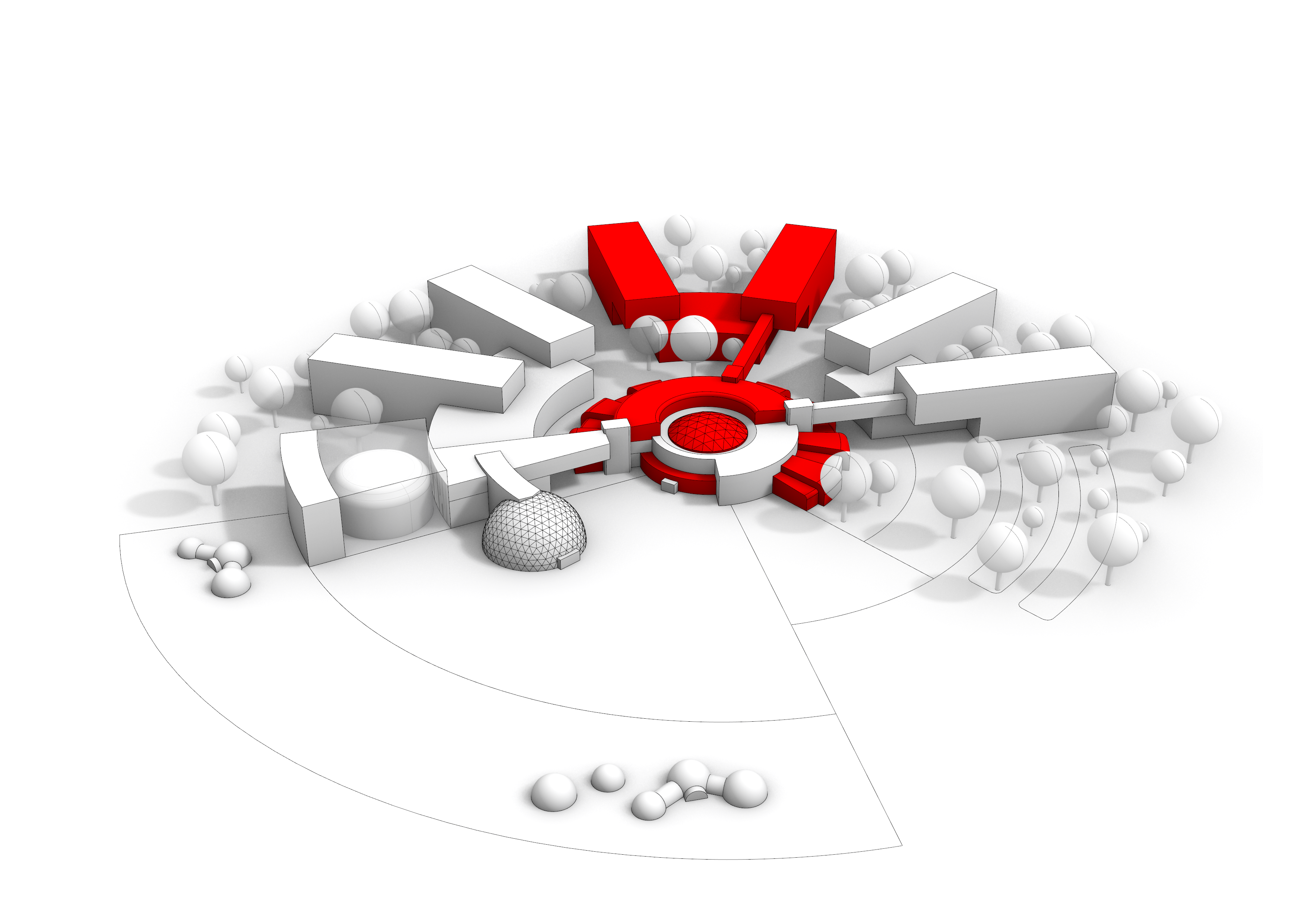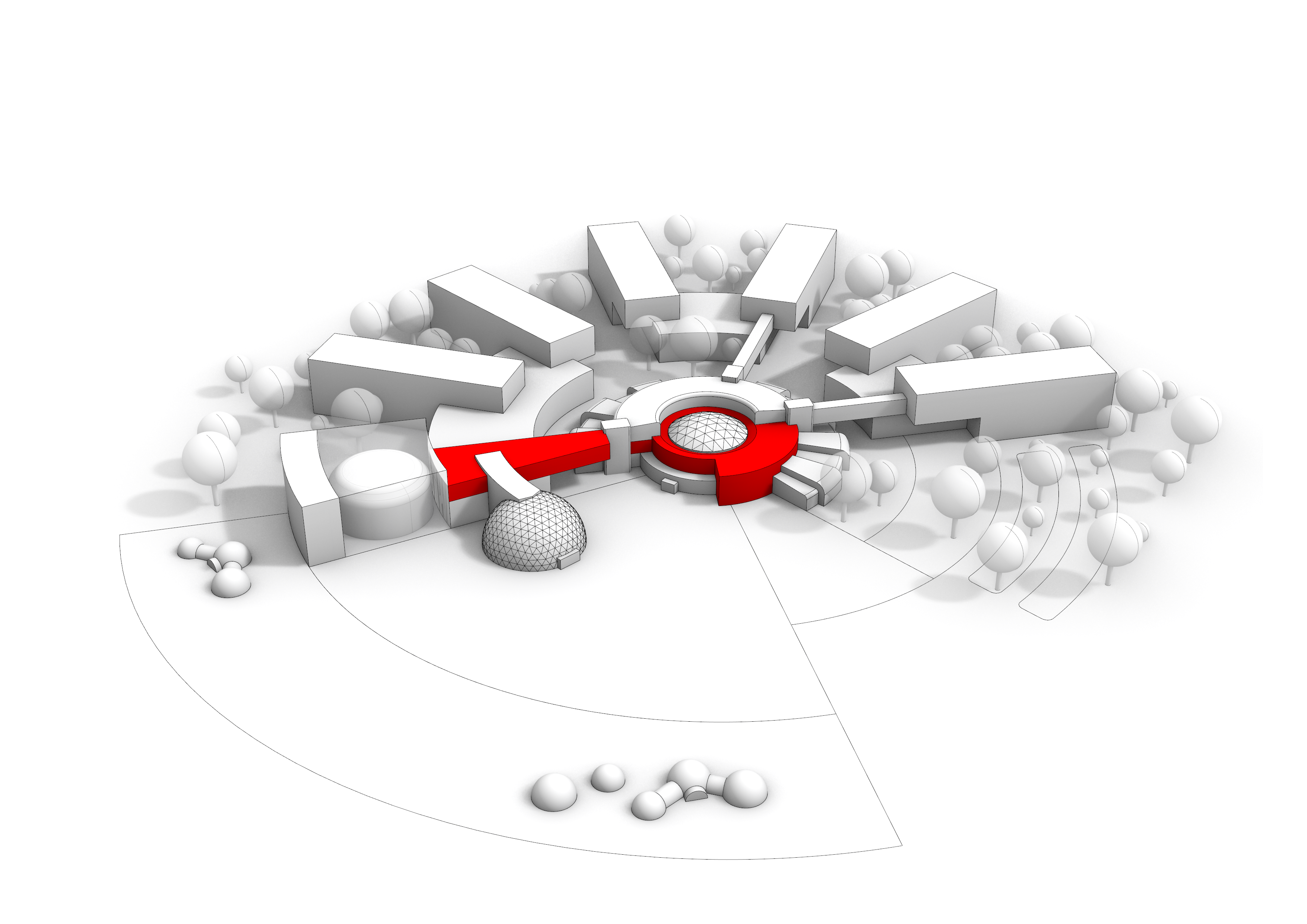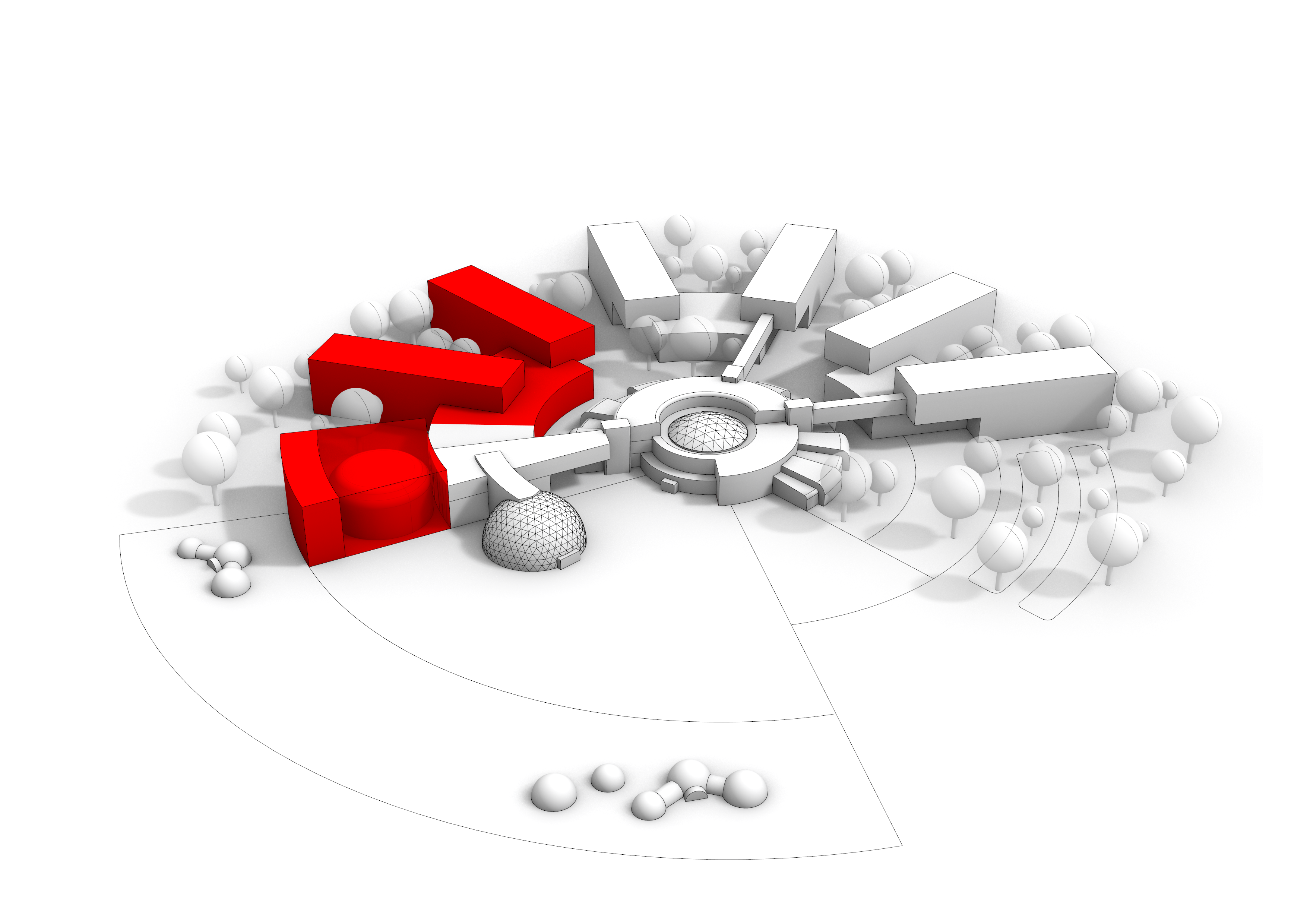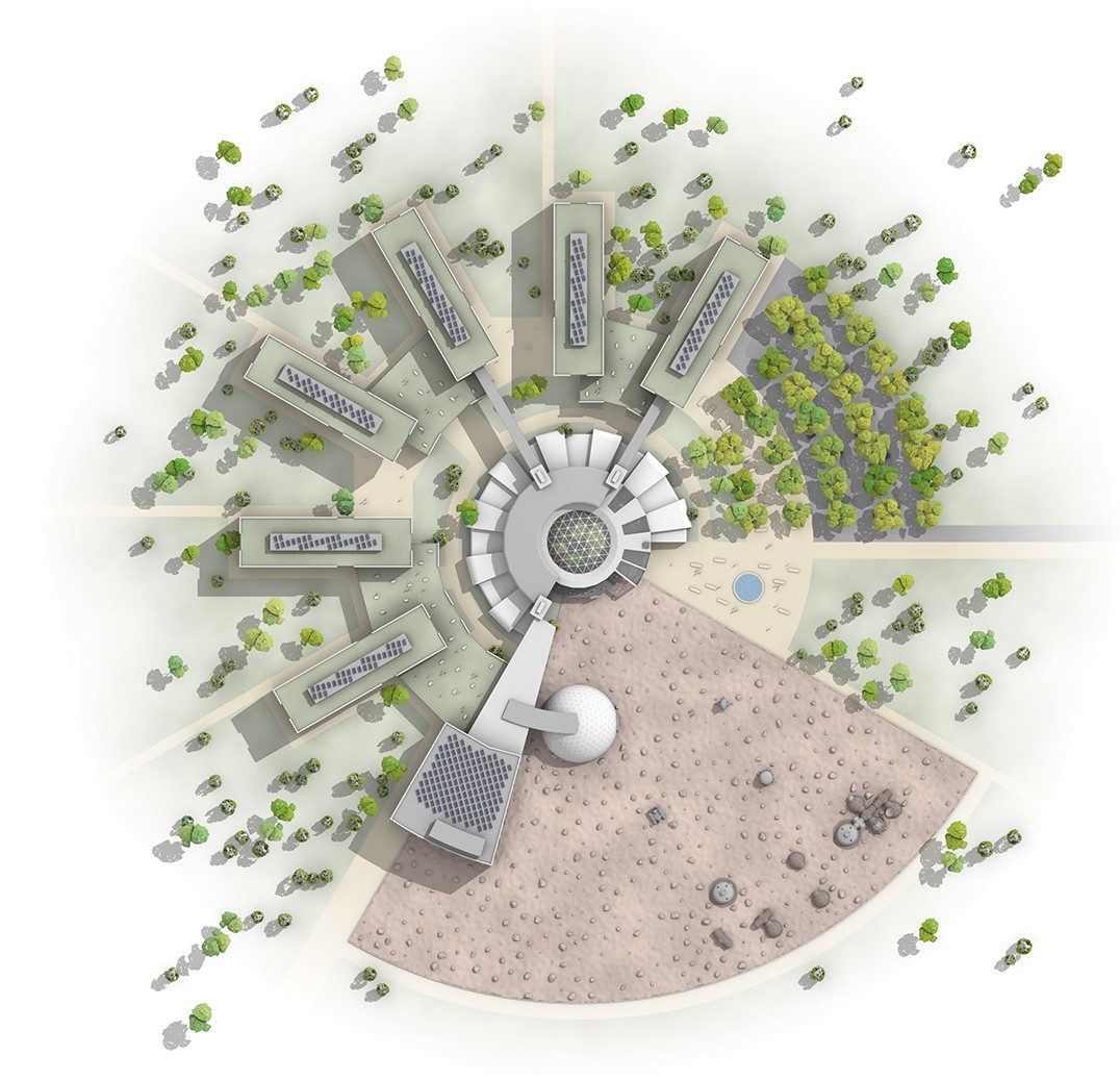 Im Zentrum des ERIS-Campus steht das Forschungsgebäude mit den zentralen Infrastruktureinrichtungen sowie Büro- und Laborgebäuden für ca. 1.000 Wissenschaftler. Die kompakte Bauweise sowie die bestehenden Verbindungen zwischen allen Gebäudeteilen fördern den wissenschaftlichen Austausch über Disziplinengrenzen hinweg. Ein zentrales Missions-Kontrollzentrum ermöglicht die Überwachung und Steuerung sowie Zusammenschaltung aller Versuchseinrichtungen, so dass komplexe Simulationsmissionen ermöglicht werden. Ein integriertes Besucherzentrum ermöglicht Einblicke in die zentralen Forschungsbereiche sowie eindrucksvolle Erlebnisse wir virtuelle Führungen in Mond- und Marsstationen, um das Bewusstsein für den Wert von Ressourcen und deren nachhaltige Nutzung zu vermitteln.