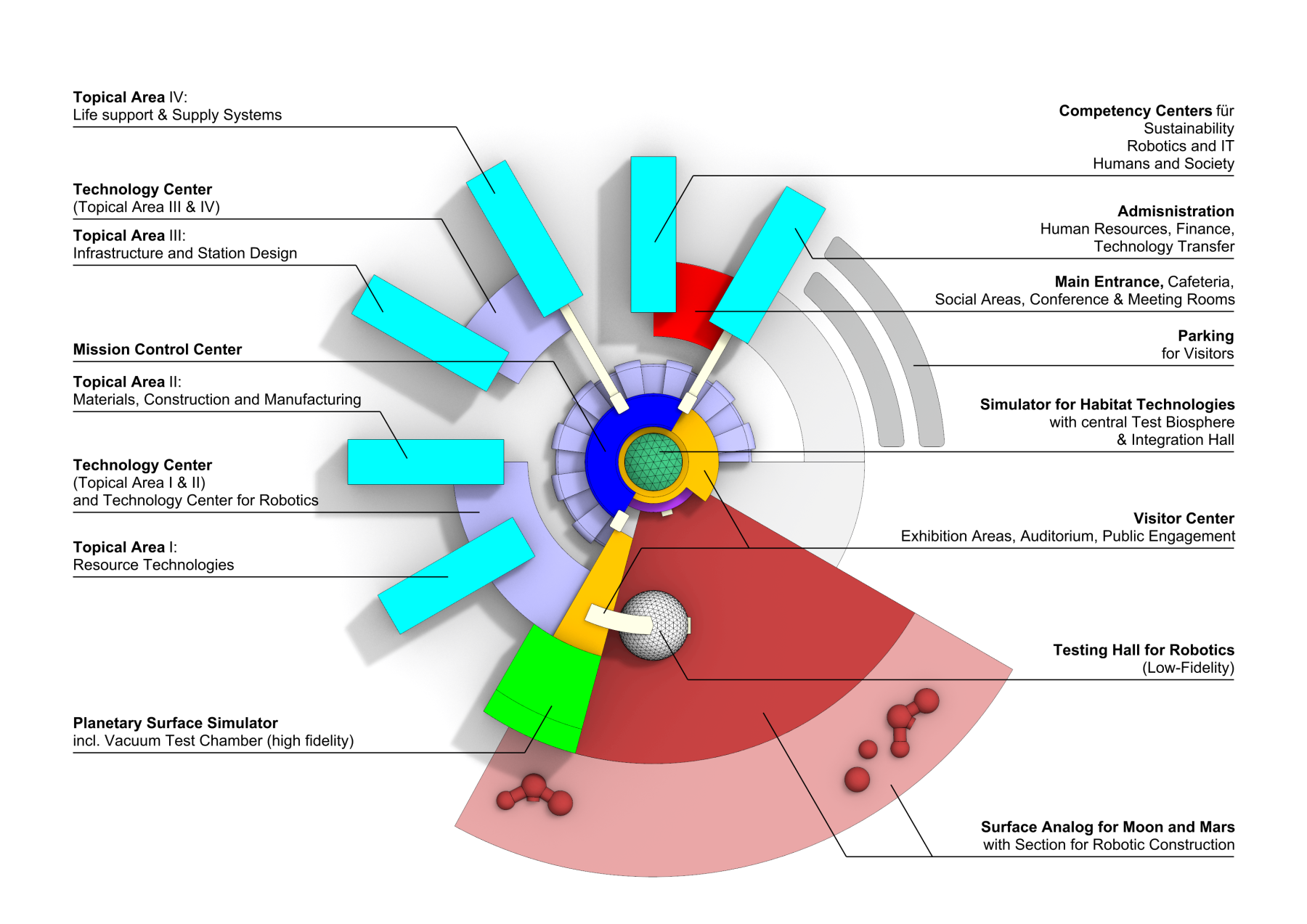 In the centre of the ERIS campus is the research building with the central infrastructure facilities as well as office and laboratory buildings for around 1,000 scientists. The compact design and the existing connections between all parts of the building promote scientific exchange across disciplines. A central mission control centre enables the monitoring and control as well as the interconnection of all test facilities, so that complex simulation missions are possible. An integrated visitor centre provides insights into the central research areas as well as memorable experiences such as virtual tours of bases on the Moon and Mars to convey awareness of the value of resources and their sustainable use.